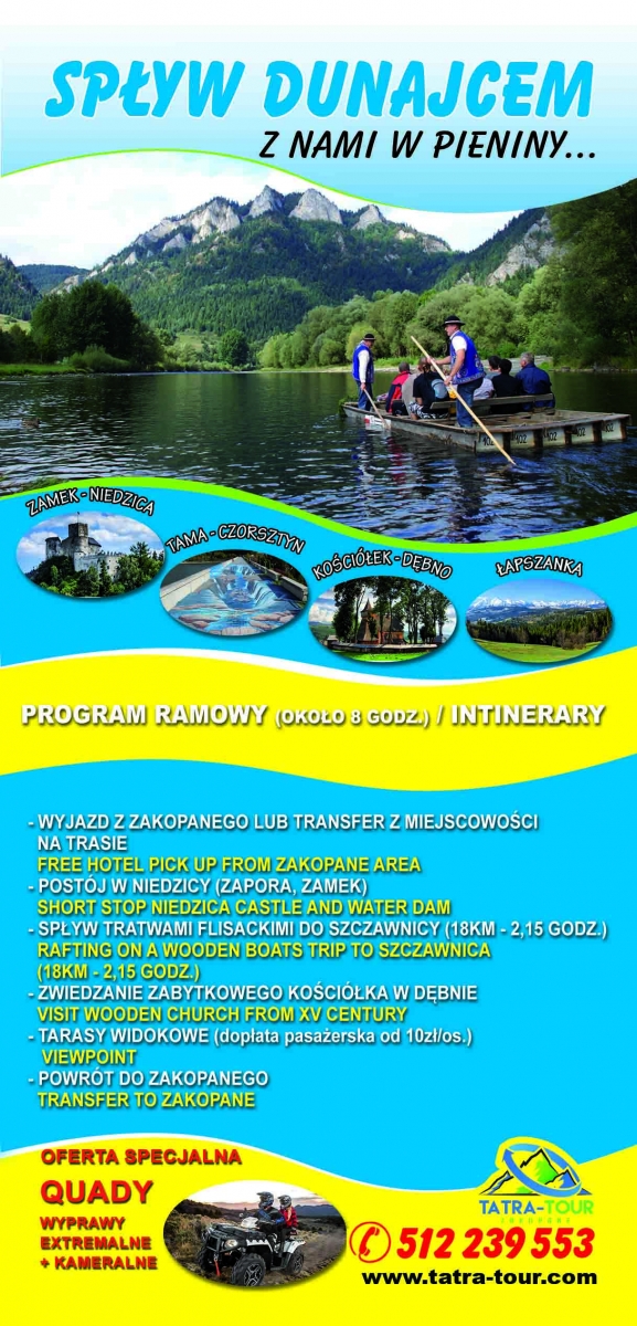 Spływ Dunajcem powinien znaleźć się w planach każdego turysty, który odwiedza Zakopane. Spływ meandrującym Dunajcem organizowany jest na tradycyjnych tratwach. Jest to okazja do pooddychania świeżym powietrzem, wyciszenia się wśród szumów rzeki oraz posłuchania ciekawych historii na temat gór. Spływ Dunajcem to atrakcja, która pozwala przenieść się do czasów staropolskiej tradycji i podziwiać uroki rzeki z drewnianej tratwy. Flisacy umilają ten czas opowieściami góralskimi oraz legendami, na temat tego, jak powstał przełom Dunajca. Spływ jest okazją do odpoczynku po wyczerpującej wędrówce szlakami górskimi oraz możliwością wyciszenia umysłu od przyziemnych spraw, dzięki czemu uczestnicy schodzą z tratwy naładowani pozytywną energią.